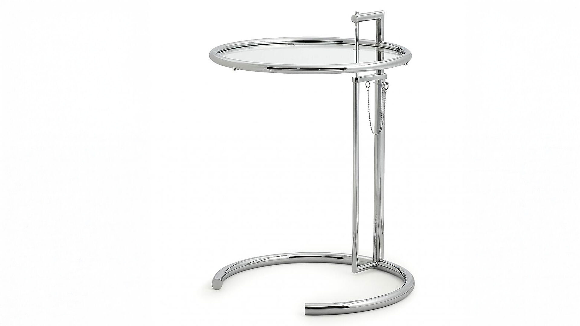 Classicon Adjustable Table E 1027 Eileen Gray in chrome & clear glass height-adjustable at Grünbeck Vienna | Among the classics, this is arguably the classic. Its ingeniously proportioned,…