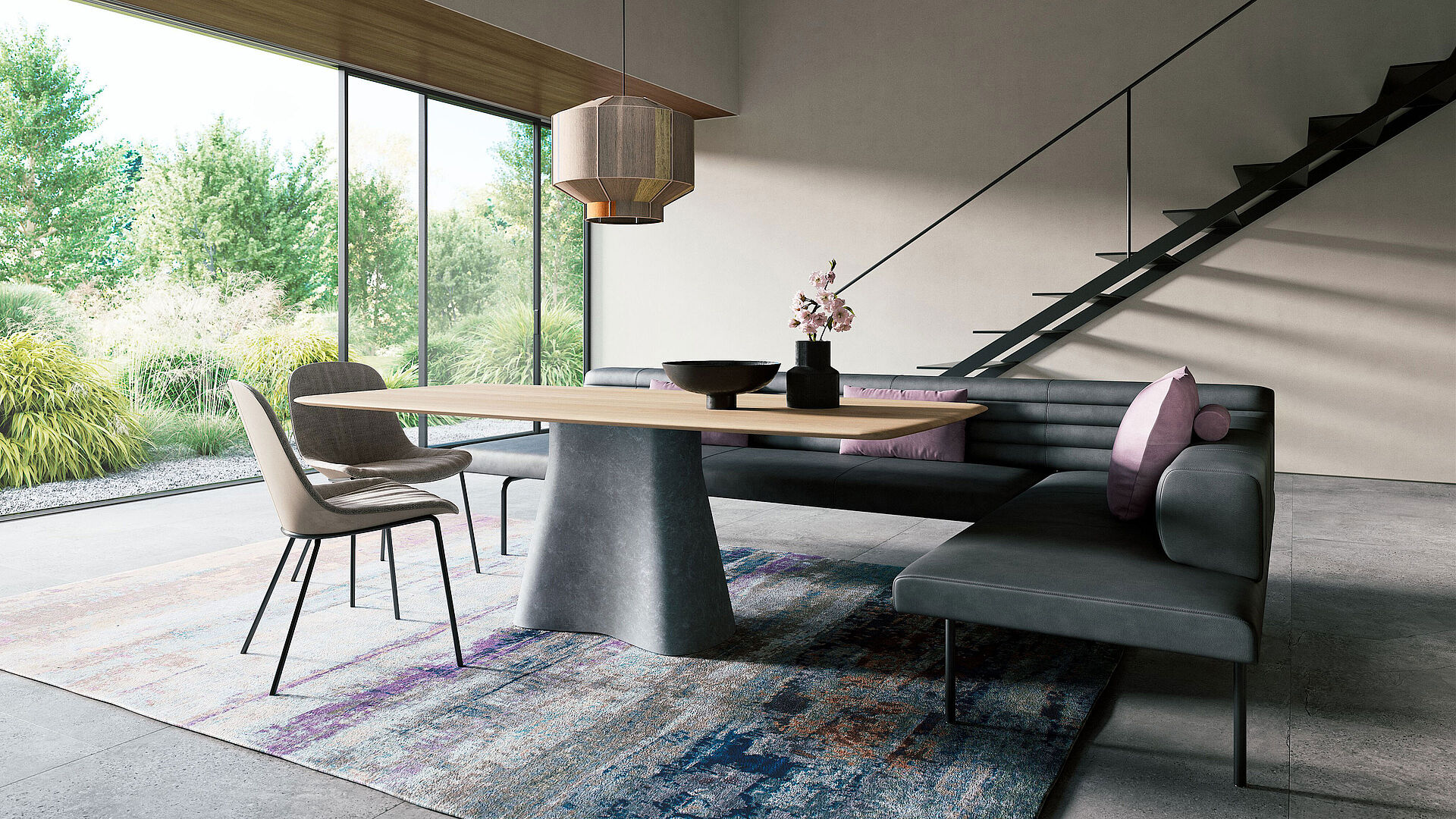 A new interpretation of the classic corner bench – Ison. Light, minimal, complex. The upholstered bench embraces the principle of modernity: less is more. It can be freestanding and radiates lightness. As a corner bench, sofa bench, bench for dining – for working and living.