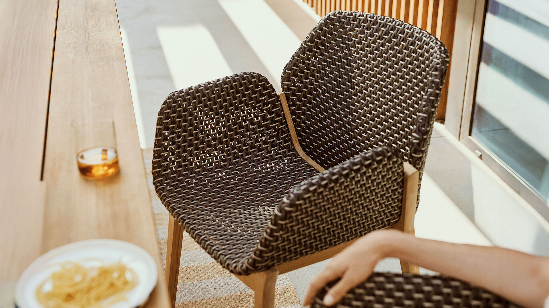 CALADIO steht für echtes Handwerk: Drei unterschiedliche DEDON Fasern werden für die Schale zu einem kunstvoll komponierten Design verflochten. Das handgeflochtene Geflecht ruht auf einem CNC-gefrästen Massivholzgestell aus zertifiziertem Teakholz. Die handwerklich herausfordernde graphische Flechtung umschließt Sitzfläche, Arm- und Rückenlehne nahtlos und umhüllt das innere Tragwerk des Stuhls. So entsteht eine fast wie gepolstert wirkende Sitzschale, die auf vier konisch zulaufenden Teakbeinen ruht.
