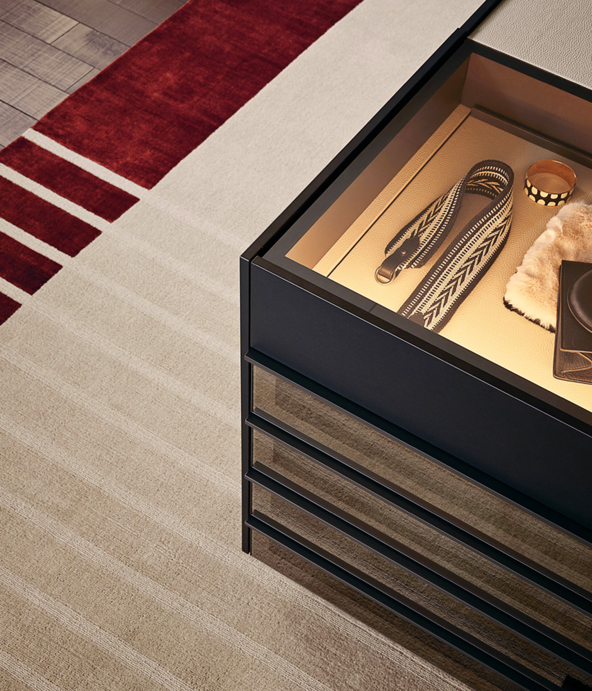 Set Up ist eine Insel-Kommode mit offenen Fächern, Schubladen und einer edlen Glasplatte samt Beleuchtung. Ideal in der Mitte eines begehbaren Kleiderschranks.