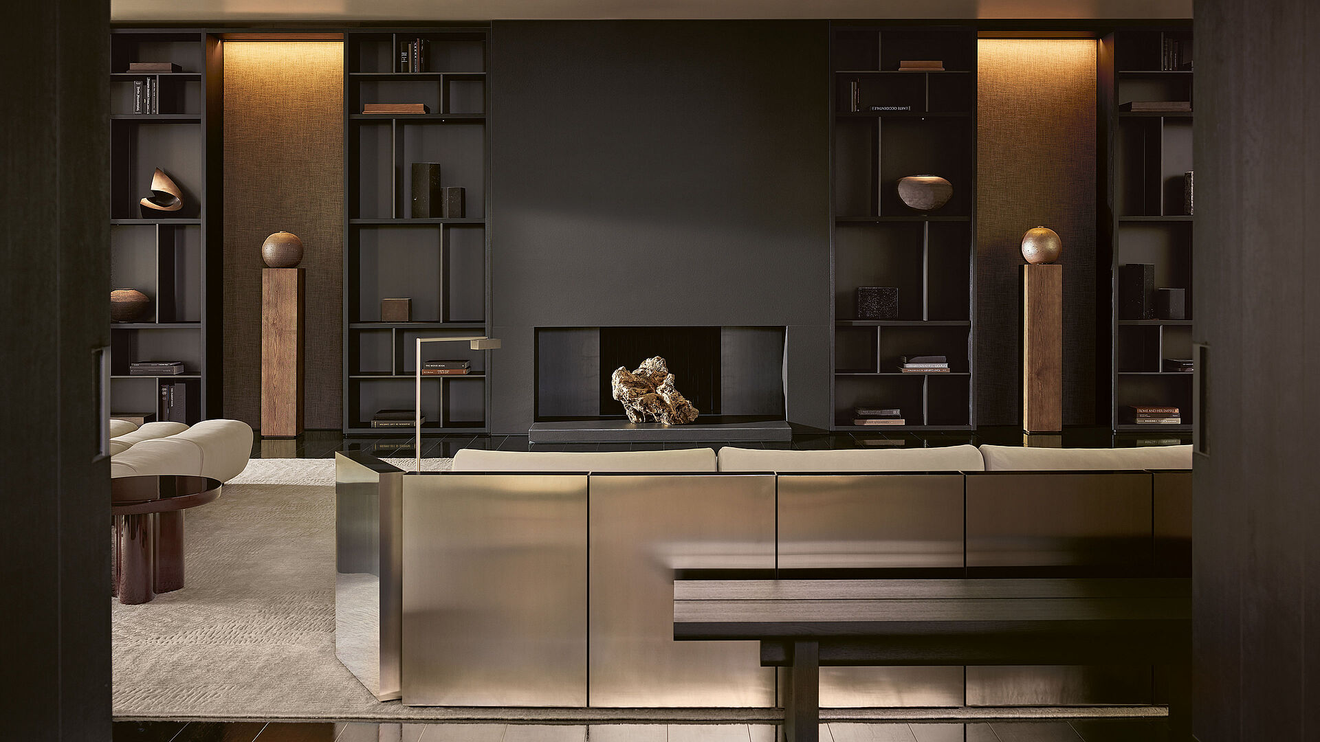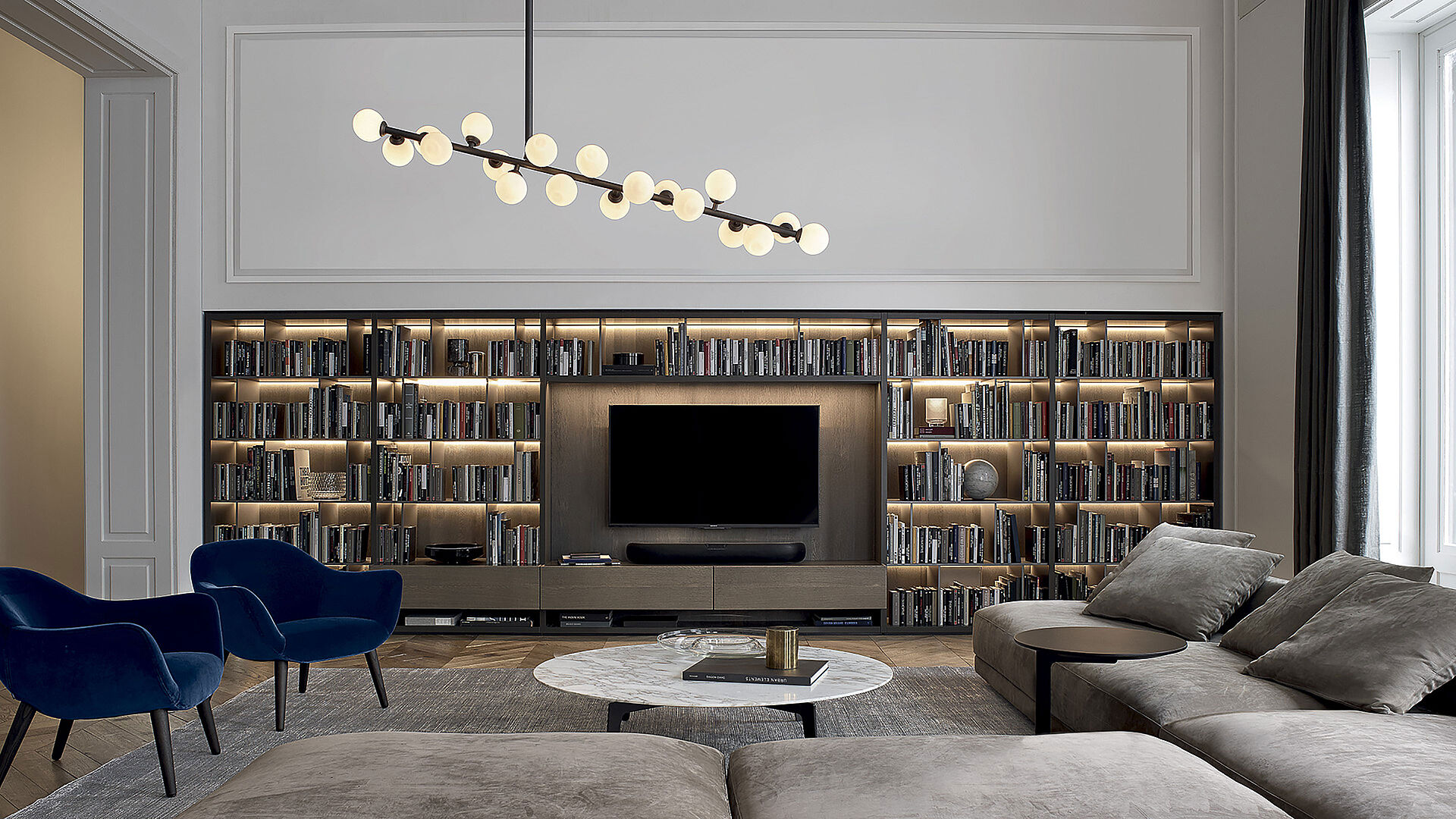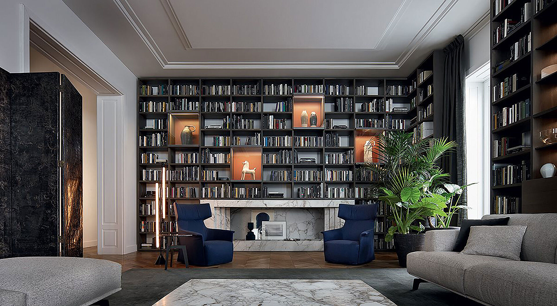 Wall System von Poliform ist ein erfolgreiches Einrichtungsprogramm mit außergewöhnlicher Vielseitigkeit. In ständiger Weiterentwicklung basiert es auf dem Bücherregal als ästhetischem und funktionalem Zentrum des Wohnzimmers. In Kombination mit Regalen und Türen, Vitrinen oder Rückenteilen aus edlen Materialien wie Marmor kann mit einer Reihe von Elementen die Funktionalität erweitert und das Design des Bücherregals hervorgehoben werden.