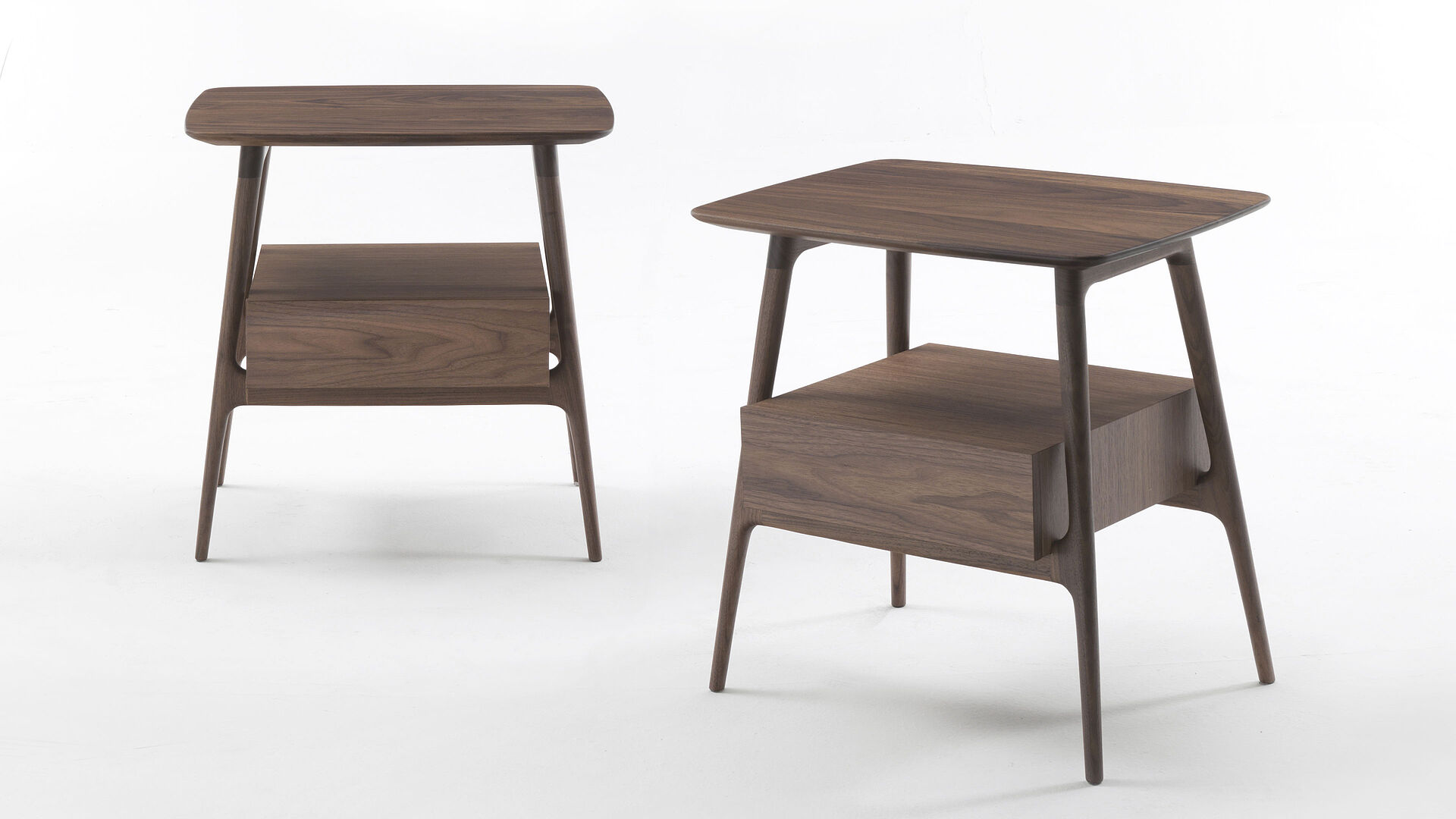 Die kleine Porada Kommode Bilot ist gefertigt aus massivem Nussbaum mit einer Lade und kann ideal als Nachttisch verwendet werden.