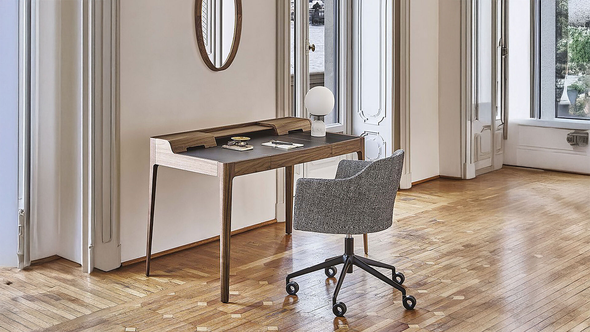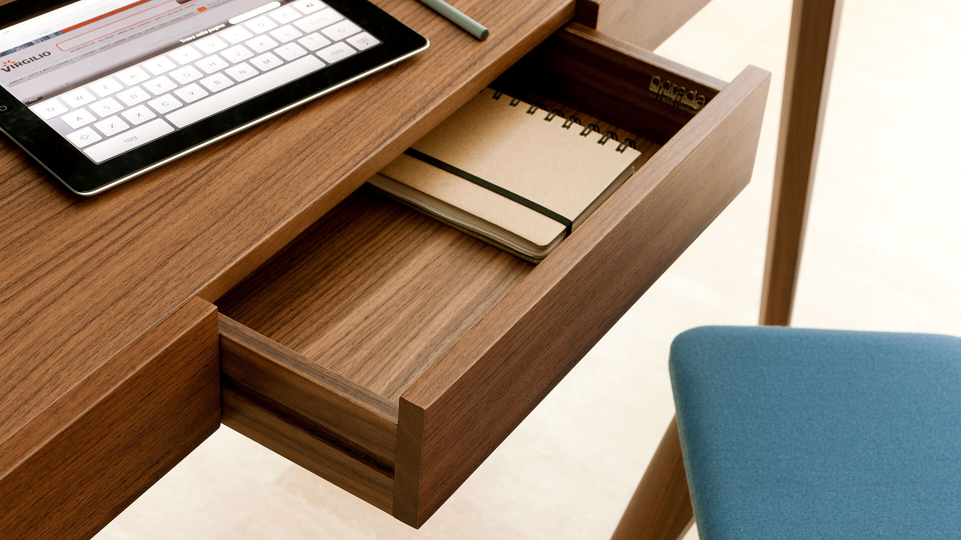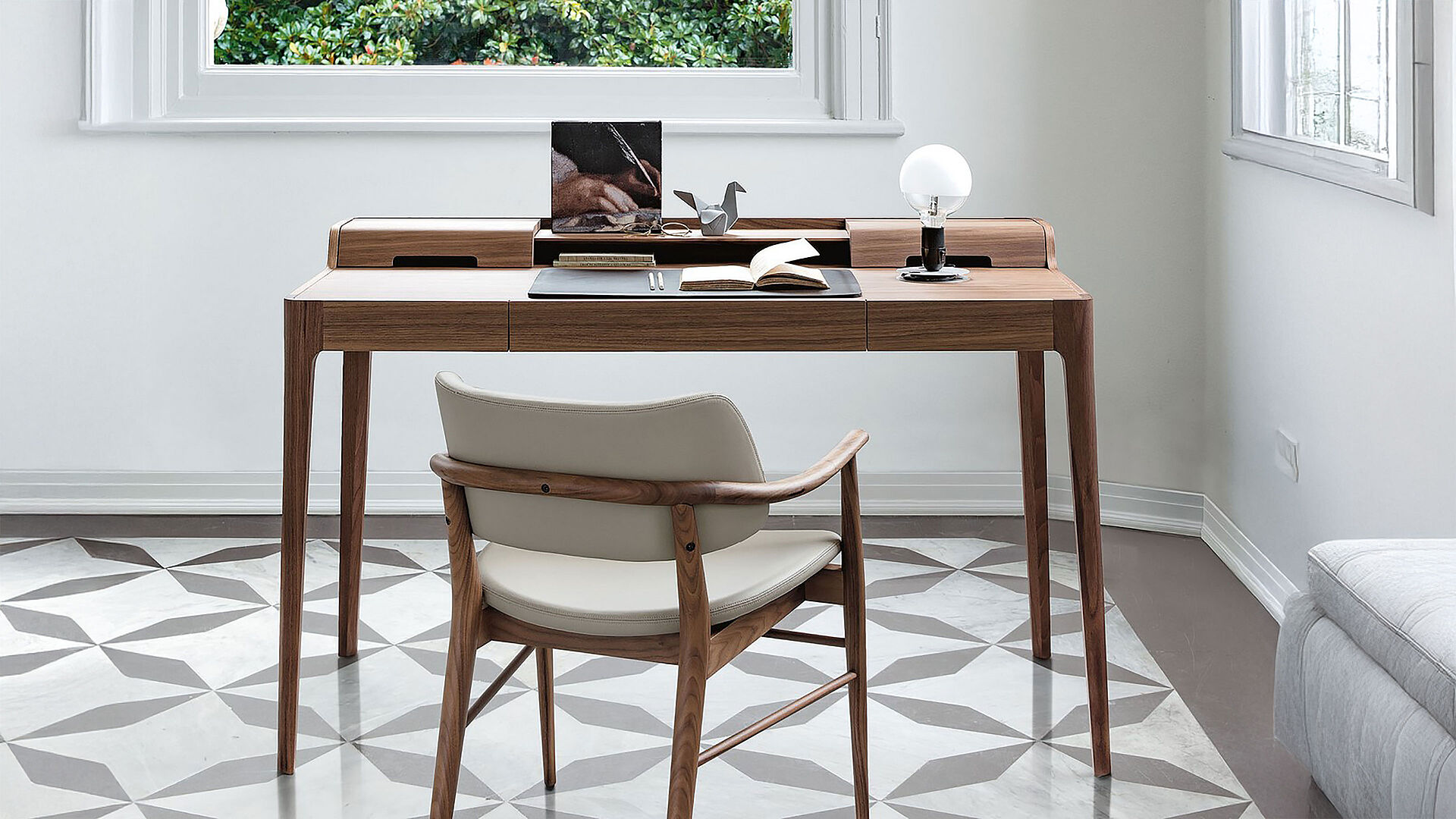 Der Porada Schreibtisch Saffo ist gefertigt aus massivem Nussbaum mit einer Schreibtischlade und hat eine versteckte Kabeldurchführung und Schreibauflage aus Leder. In der Version Saffo cuoio ist der Schreibtisch mit einer durchgehenden Lederplatte erhältlich.