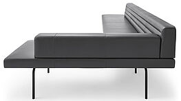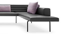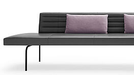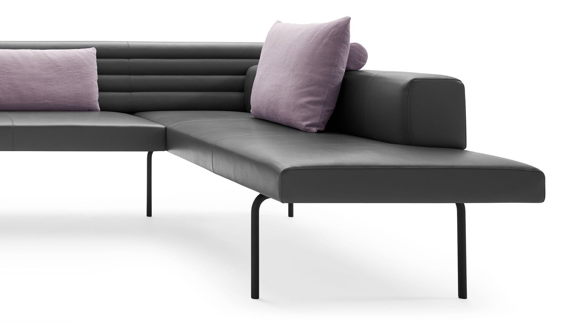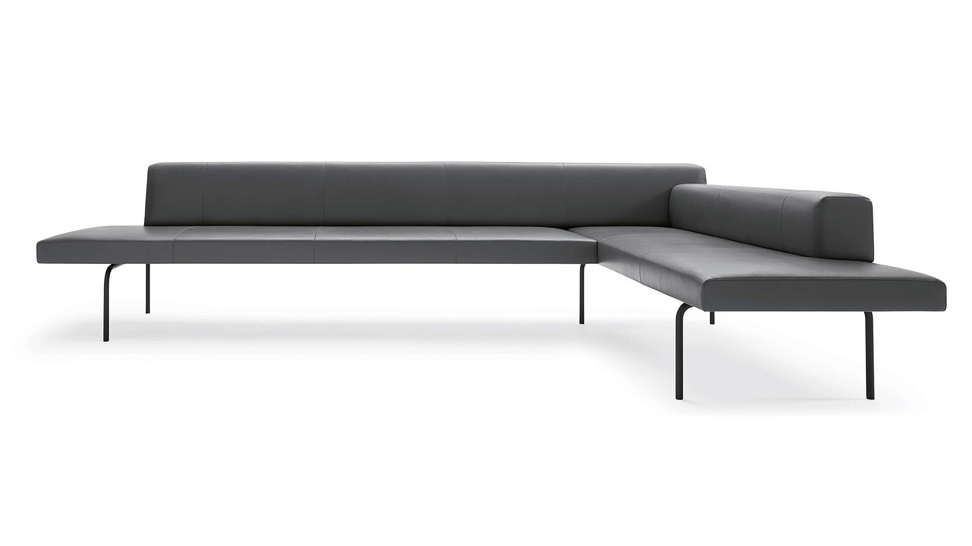 Eine neue Interpretation der klassischen Eckbank: Leicht, minimal, komplex. Die gepolsterte Bank lebt das Prinzip der Moderne: Weniger ist mehr. Sie kann frei im Raum stehen und strahlt Leichtigkeit aus. Als Eckbank, Sofabank, Essbank – for Working and Living.